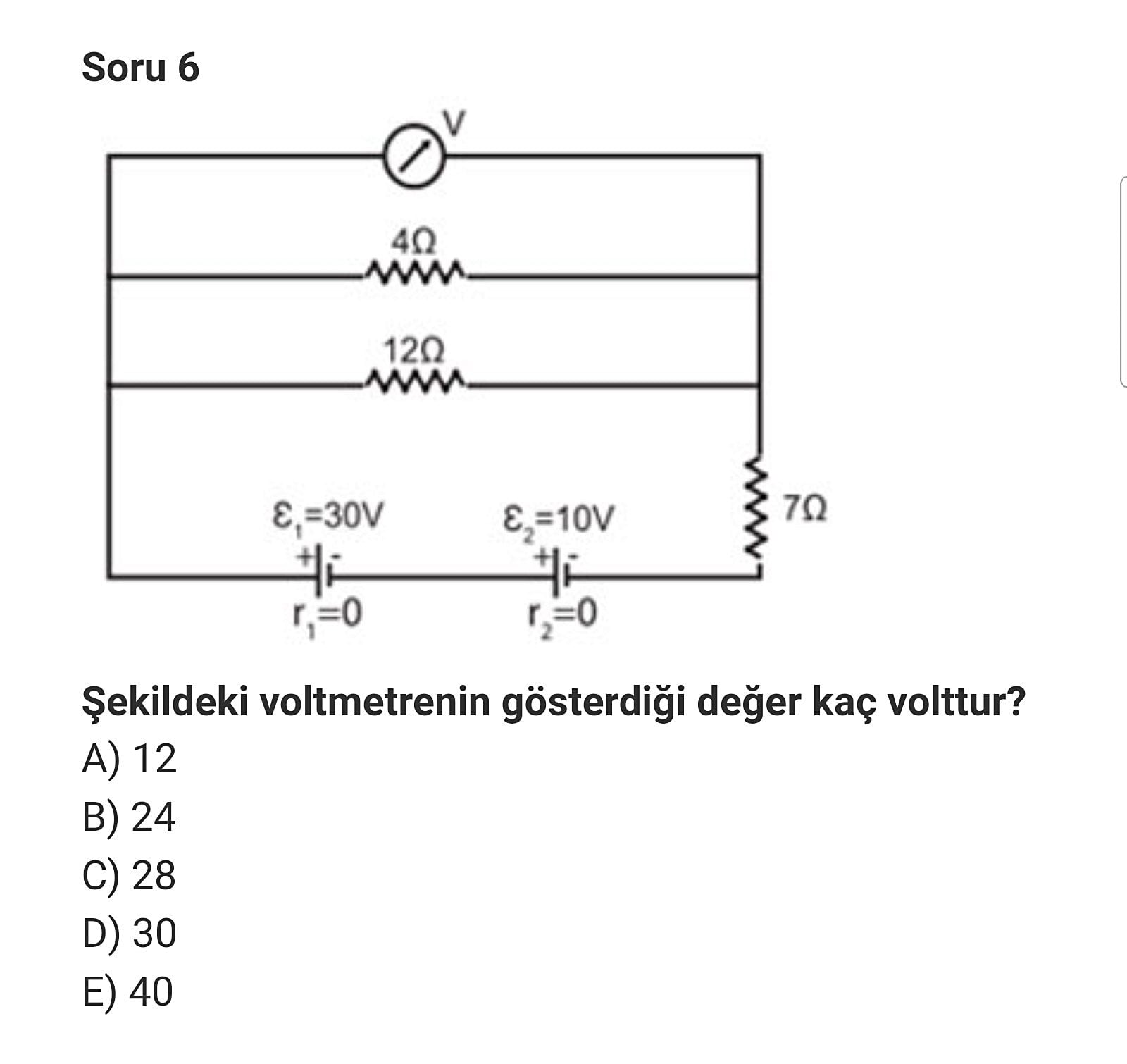 V= i x r ise V= 4 amper x 7 ohm olur. 28 volt buluyorum. Demek ki sorulan kısımda 12 volt gerilim düşüyor, 7 ohmluk dirençte ise 28 volt gerilim düşüyor, paralel bağlı dirençlerimiz aslında 3 ohmluk görev yapıyor ve bu devre toplamda üreteçlerden 10 amper akım çekiyor.