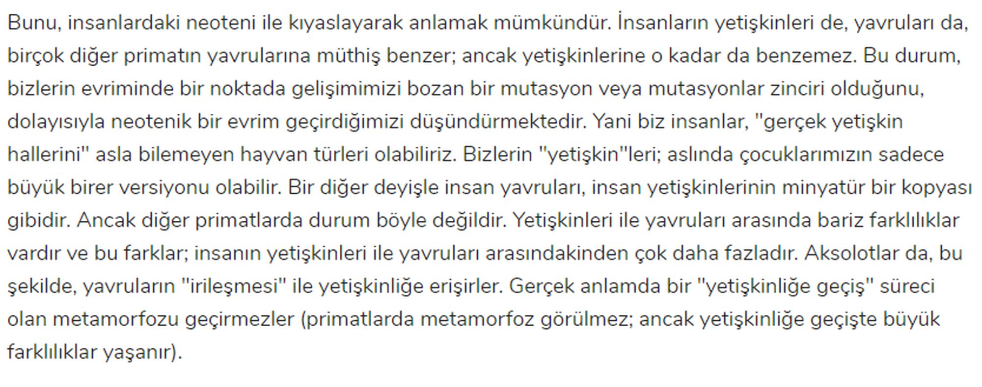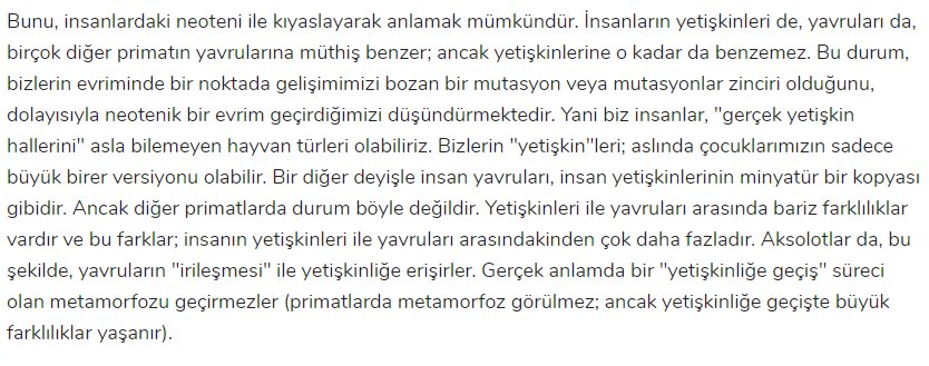 Aksolot semenderi bahsi geçen mutasyona sahip olmasa büyük ihtimalle zamanla kuyruğu düşecek, yüzü incelecek, erişkin bir kurbağaya benzeyecekti. Insanlarda da benzer bir durum var. çocuksu bazı özellikler (pürüzsüz cilt, kadınlarda iri göz, küçük burun/çene, düz alın vs.) gözleniyot. İnsanların, "evcilleşirken" çocuksu özellikleri koruyarak evrimleşmesi söz konusu - azalan kıllanma, büyük gözler ve kafatası, görece uzun kol ve bacaklar, daha uysal bir mizaç vs. Cinsel seçilim bunda rol oynamış olmalı.