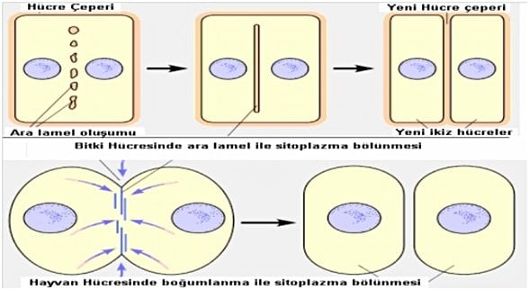 Hayvan hücrelerinde boğumlanma bitki hücrelerinde hücre plağı oluşumu ile sitokinez tamamlanır.Böylece birbirinin genetik kopyası olan yavru hücreler oluşur.