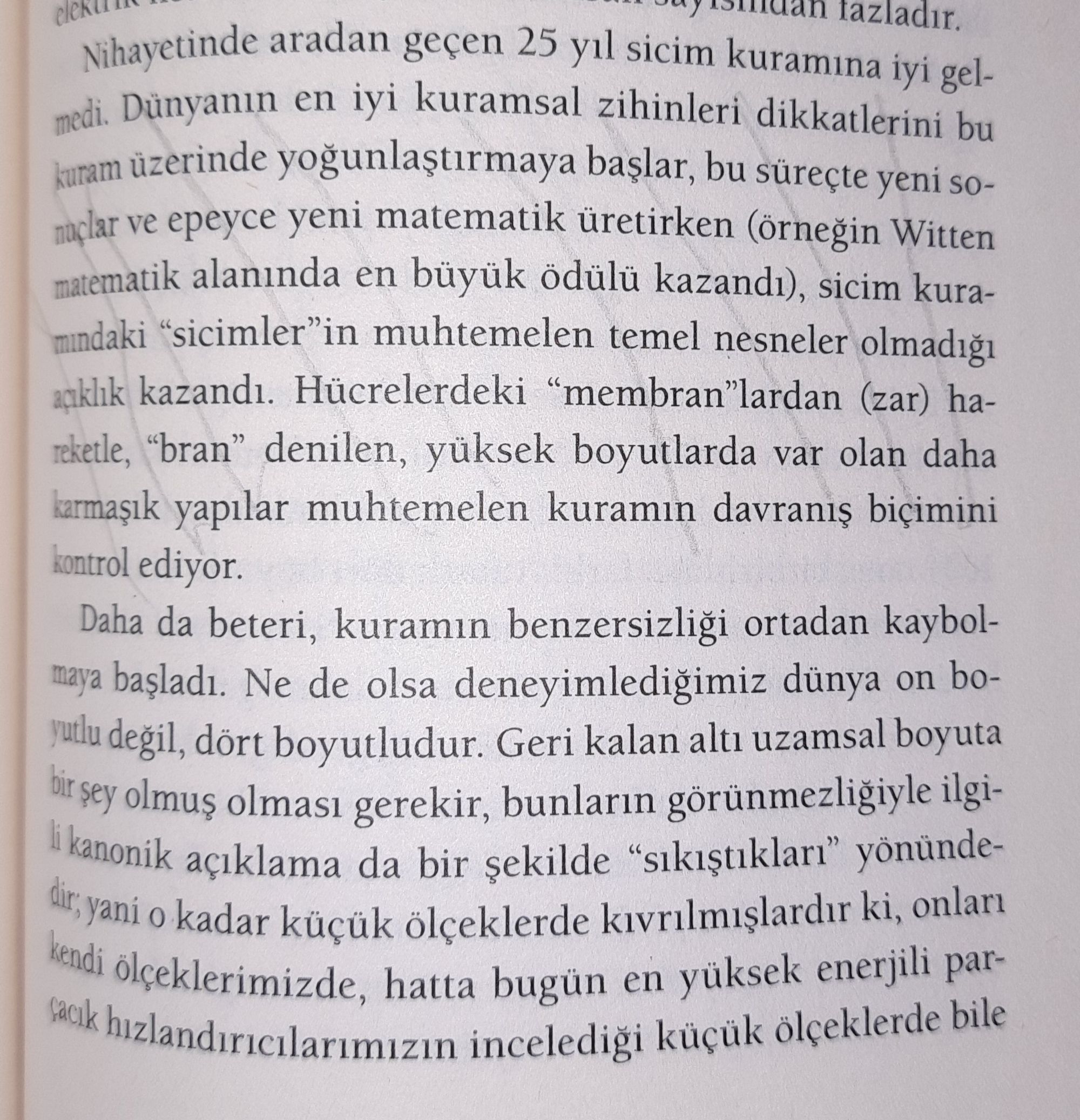 Sicim teorisi hakkında pek bir yetkinliğimin söz konusu olmadığını belirterek, bunun sebeplerinden birini sicim teorisini kanıtlayabilecek bir teknolojik etkenliğe sahip olmayışımız ve fizik seven parlak genç beyinlerin sicim teorisi gibi alanlara yöneldikten asla ispatlayamayacağı bir olguyu ortaya attıktan sonra sadece beyin jimnastiği yapması gibi sebeplerden ötürü olabileceğini düşünüyorum zaten şahsi fikrimce bilimi bilim yapan sorduğun sorular ardına yeni sorular vermesi ve sorduktan sonra geriye bıraktığın cevapların fiziksel anlamda bir karşılığı olup olmamasına dayalıdır bu sebeple sicim teorisi benim gözümde sadece bir beyin jimnastiği ya da matematikten ibaret.