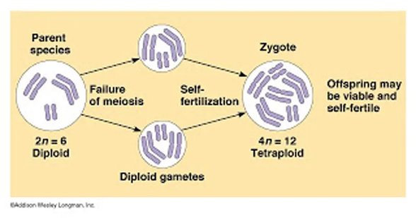 Şekilde görebileceğiniz gibi, en soldaki hücre mayoz bölünme geçirir ve normalde bir çift kromozom setine (2n) sahip olan ana hücrenin, DNA kopyalanması sonucu kromozom miktarını iki katına çıkarması (4n) ve sonrasında bunları yavrularına paylaştırarak her biri bir kromozom setine sahip (n) 4 adet hücre oluşturması beklenir. Ancak doğa mükemmel olarak çalışamadığı için, mayozda hata meydana gelir ve bu (2n) hücreden, yine (2n) olan iki adet gamet hücresi (sperm veya yumurta) meydana gelir. Daha sonra, bunların birbiriyle birleşmesi sonucunda iki çift kromozom setine (4n) sahip bir hücre oluşur. Böylece (2n) gen setine sahip bir ebeveynin (4n) gen setine sahip bir yavrusu olur. İşte bu, çok-kromozomluluktur (polyploidy).
