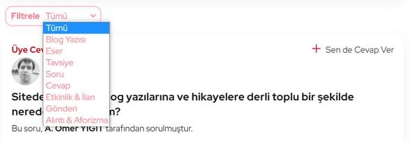Evrim Ağacı'nın Sosyal sayfasındaki "Filtrele" kısmını kullanarak blog yazısı, eser, tavsiye, soru, cevap, etkinlik ve ilan, gönderi, alıntı ve aforizma gibi birçok paylaşım tipine yönelik içerikleri derli toplu biçimde görebilirsiniz.