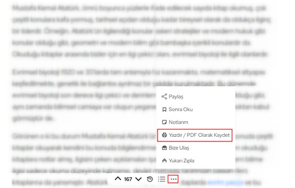 İndirmek istediğiniz içeriğe geldikten sonra alttaki bardan üç nokta butonuna tıklayın. Ardından "Yazdır/PDF olarak Kaydet" butonuna tıklayın. Açılan sayfada tarayıcınızda veya yazıcınızda içeriği PDF olarak kaydetmek için gerekli ayarları yaptıktan sonra içeriği PDF olarak indirebilirsiniz.