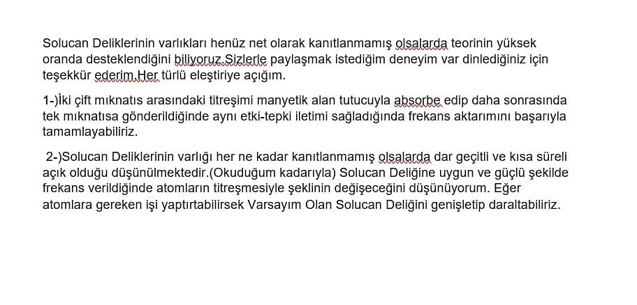 1-)İki çift mıknatıs arasındaki titreşimi manyetik alan tutucuyla absorbe edip daha sonrasında tek mıknatısa gönderildiğinde aynı etki-tepki iletimi sağladığında frekans aktarımını başarıyla tamamlayabiliriz. 2-)Solucan Deliklerinin varlığı her ne kadar kanıtlanmamış olsalarda dar geçitli ve kısa süreli açık olduğu düşünülmektedir.(Okuduğum kadarı