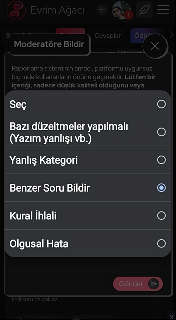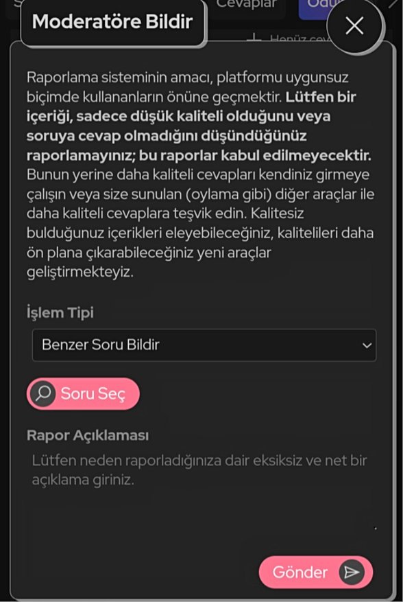 Bot yok, ama üyeler kendileri raporlayarak moderatörlere bildirebilir. En kısa sürede halledilecektir. "Gönderiyi Raporla"ya tıklayarak, oradan "Benzer Soru Bildir" seçeneğini kullanabilirsiniz. Çıkacak olan "Soru Seç" kısmında ilgili sorunun başlığını yazarsanız, belirli bilgiler ile birlikte ekrana yansıyacaktır. Eğer neden raporladığınız ile ilgili kısa bir açıklama yaparsanız, artık bildirmiş olursunuz, "Gönder"e bilirsiniz.
