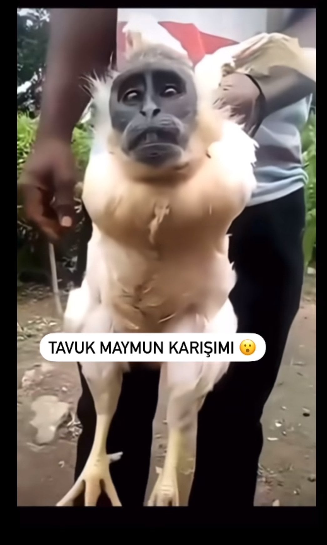 ölü bir maymunun kafasını kesip, arka taraftan oyup, bir tavuğun kafasına geçirmişler. gerçek olması mümkün değil zaten.