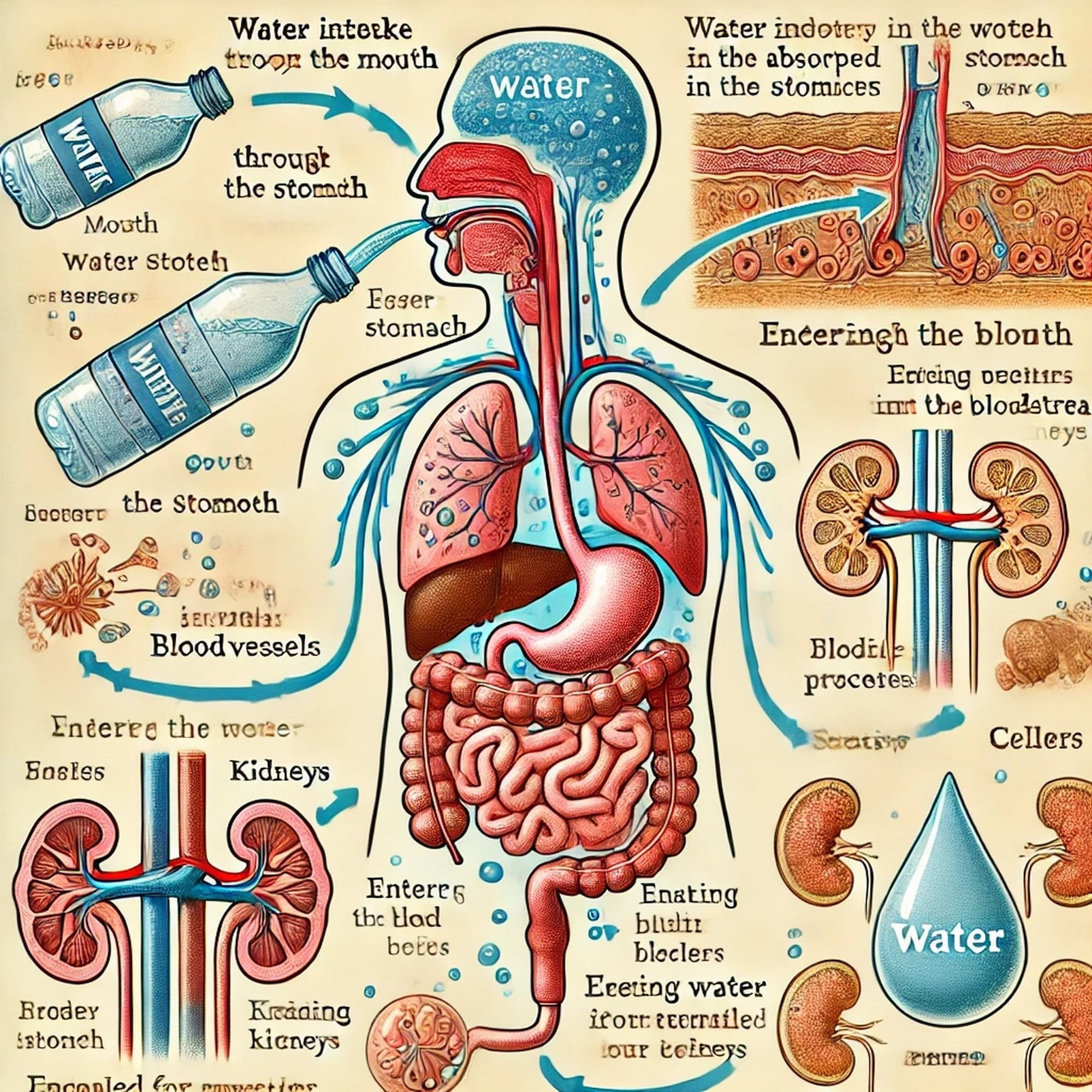 Su içilince, mide tarafından sindirim işlemine tabi tutulmadan, ince bağırsağa geçer. İnce bağırsakta yine işleme tabi tutulmadan tıpkı vitamin ve mineraller gibi kana karışır. Kan'a karışan su ihtiyaç duyulan doku ve organlar tarafından kullanılır.