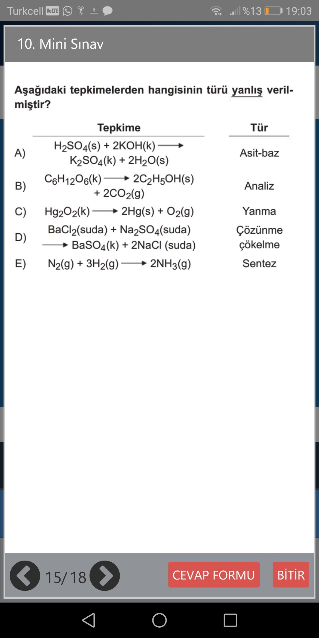 C şıkkı bir analiz tepkimesidir. B şıkkında tanımı yaptığım gibi verilen bileşik veya molekül daha küçük molekül ve elementlere ayrışmasına analiz tepkimesi denmektedir. C şıkkı yanlıştır ve cevabımızdır.