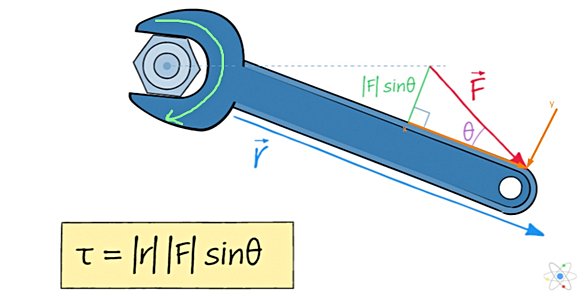 Bu tork, cıvatanın yüzeyine dik bir yön etrafında oluşan bir tork. İşte yüzeye dik olan bu 3. boyuta diyoruz ve sağ el kuralını kullanarak, bu tork sayfanın içine doğru (saat yönünde) döndüğü için, sayfanın içine doğru giren bir okun arka kısmından bakıyormuşçasına işaretini kullanıyoruz. Eğer kuvvet tam tersi yönde uygulansaydı, sayfanın içinden bize doğru gelen bir okun ucuna bakıyormuşçasına işaretini kullanıyoruz.
