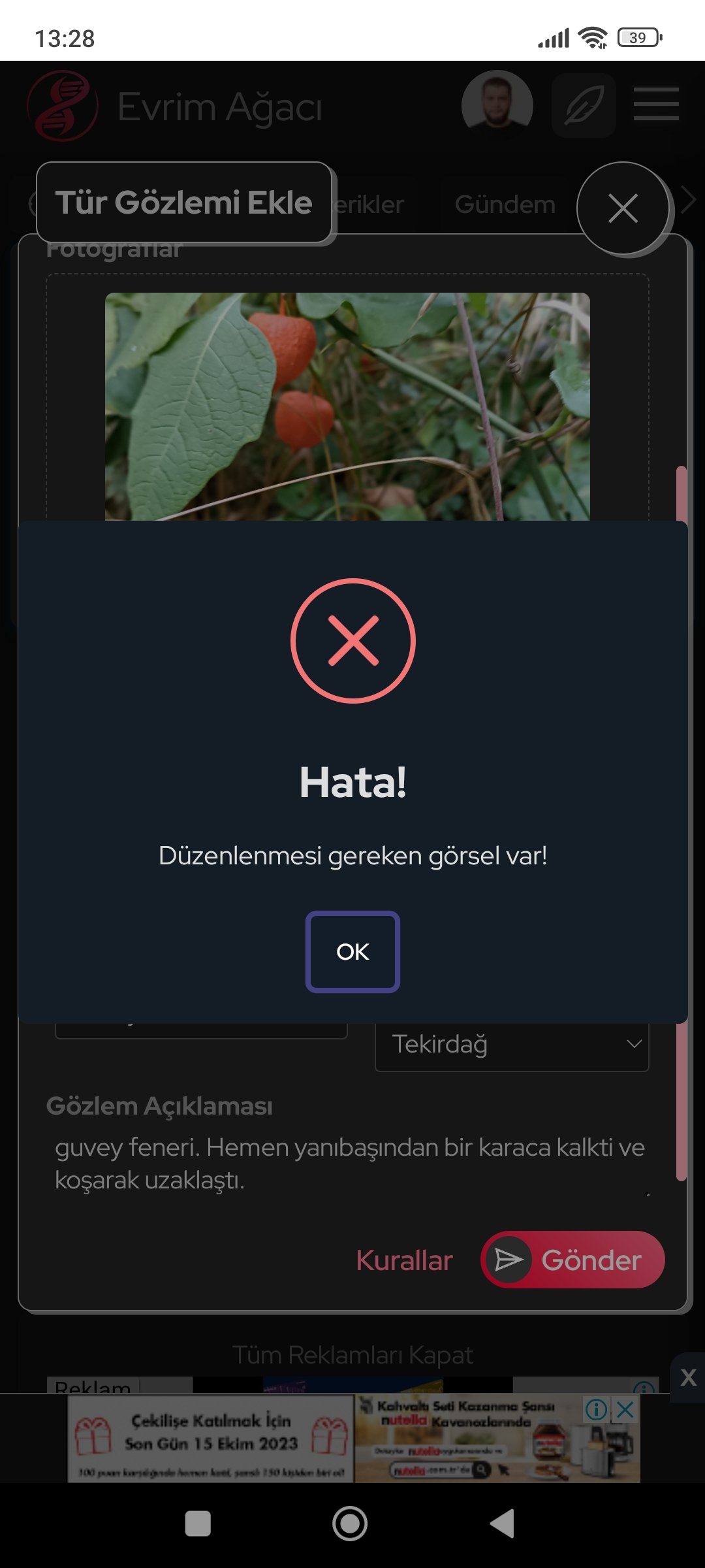 Evrim ağacına tür, kitap, eser gibi içerikler eklerken sizden istenen fotoğrafın belirli bir piksel ölçüsünde olması gereklidir. Yoksa, eklediğiniz tür kabul edilmez. Bunu düzeltmek için "Düzenle" seçeneğine tıklayarak "X Piksele Büyüt" yapabilirsiniz, eğer böyle bir yazı çıkmıyorsa da gerekli piksel ölçüsünü kapsayan başka bir fotoğraf eklemelisiniz.