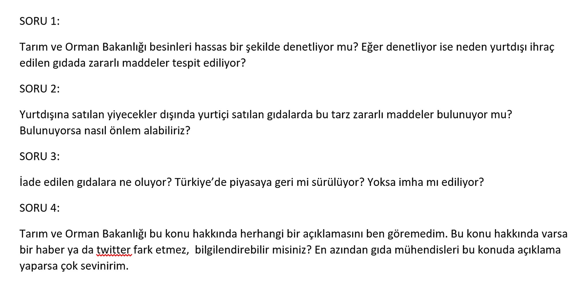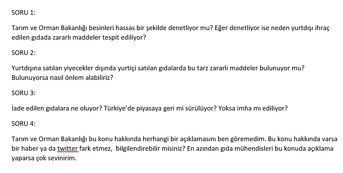 Bu soruyu herhangi bir siyasi ya da kötü bir amaç gütmeden soruyorum. Bilinçli bir vatandaş olarak ne yediğimi bilmek benim hakkımdır. Son zamanlarda çok fazla Türkiye’den ihraç edilen gıda geri çevrildi, içeriğinde zararlı madde tespit edildiği için.