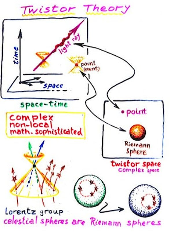 Sicim teorisinde olduğu gibi, parlak fizikçi Sir Roger Penrose'un twistor teorisi, parçacık fiziğinin Standart Modelinin kalbinde yatanlar da dahil olmak üzere mevcut fizik teorileri hakkında bazı matematiksel bilgiler sağlamıştır.