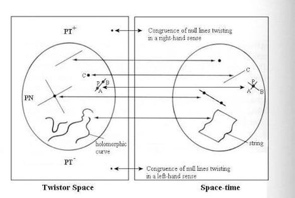 Uzay ışığında tüm ışık ışınlarını alırsanız , twistor teorisinin içinde bulunduğu matematiksel evren olan bir twistor alanı yaratır . Aslında, twistor uzayındaki nesnelerin evrenimizde nesneler ve olaylarla sonuçlanabileceğine dair bazı göstergeler vardır.