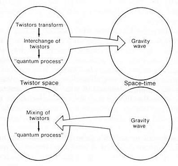 Neredeyse kırk yıldır, Penrose kendi matematiksel yaklaşımını - twistör teorisini - araştırıyor . Penrose, teoriyi güçlü bir genel görelilik yaklaşımından geliştirdi (teori sadece dört boyut gerektirir). Penrose, herhangi bir kuantum yerçekimi teorisinin, çoğu parçacık fizikçisinin ve sicim teorisyeninin katılmadığı bir şey olan fizikçilerin kuantum mekaniği hakkında düşünme biçiminde temel revizyonları içermesi gerektiğine inanıyor.