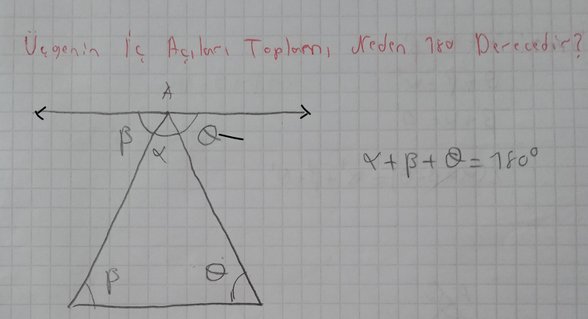 Not: Tabii ki buradaki anlatım sadece Öklidyen (düz) uzaydaki üçgenlerden bahsetmektedir. Minkowski uzayı gibi kıvrımlı bir geometride üçgenin iç açılarının toplamı 180 derece değildir.