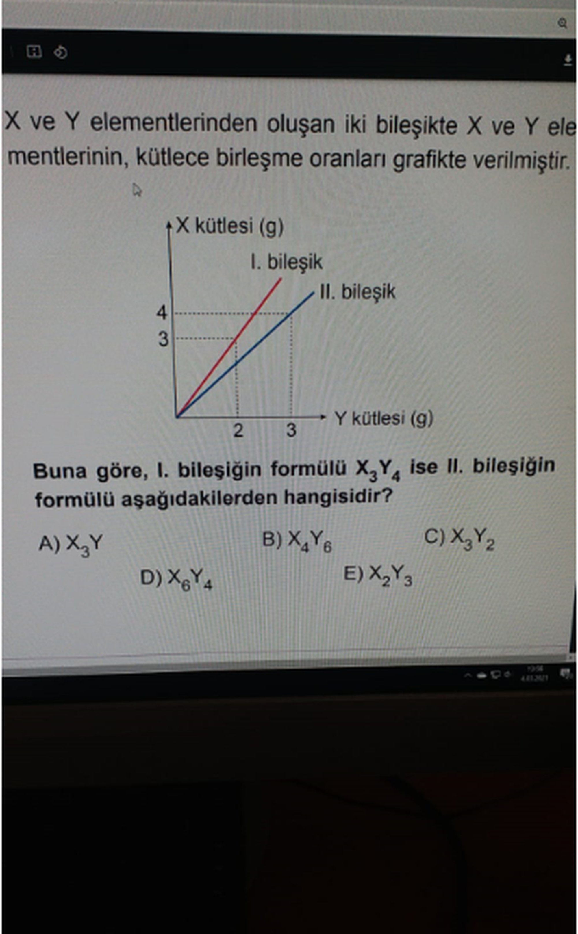 Birinci bileşik grafiğe göre 3 g x atomu içerdiğinde 2 g y atomu içeriyor. Bu bileşiğin formülü ise x3y4. Yani x atomu y atomundan iki kat ağır. 3x=3g, 4y=2 g.