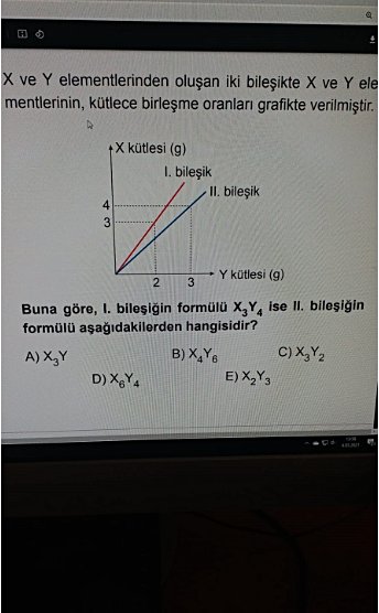 Birinci bileşik grafiğe göre 3 g x atomu içerdiğinde 2 g y atomu içeriyor. Bu bileşiğin formülü ise x3y4. Yani x atomu y atomundan iki kat ağır. 3x=3g, 4y=2 g.