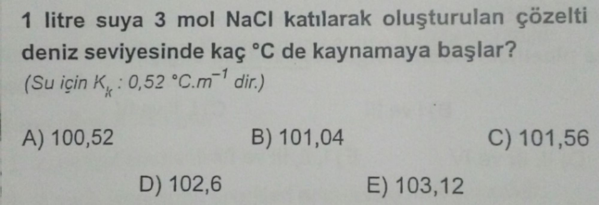 ΔTk : Kaynama noktası yükselmesi, Kk : Ebülyoskopi sabiti, m : Çözeltinin molalitesi, ts : Çözünenin tanecik sayısı