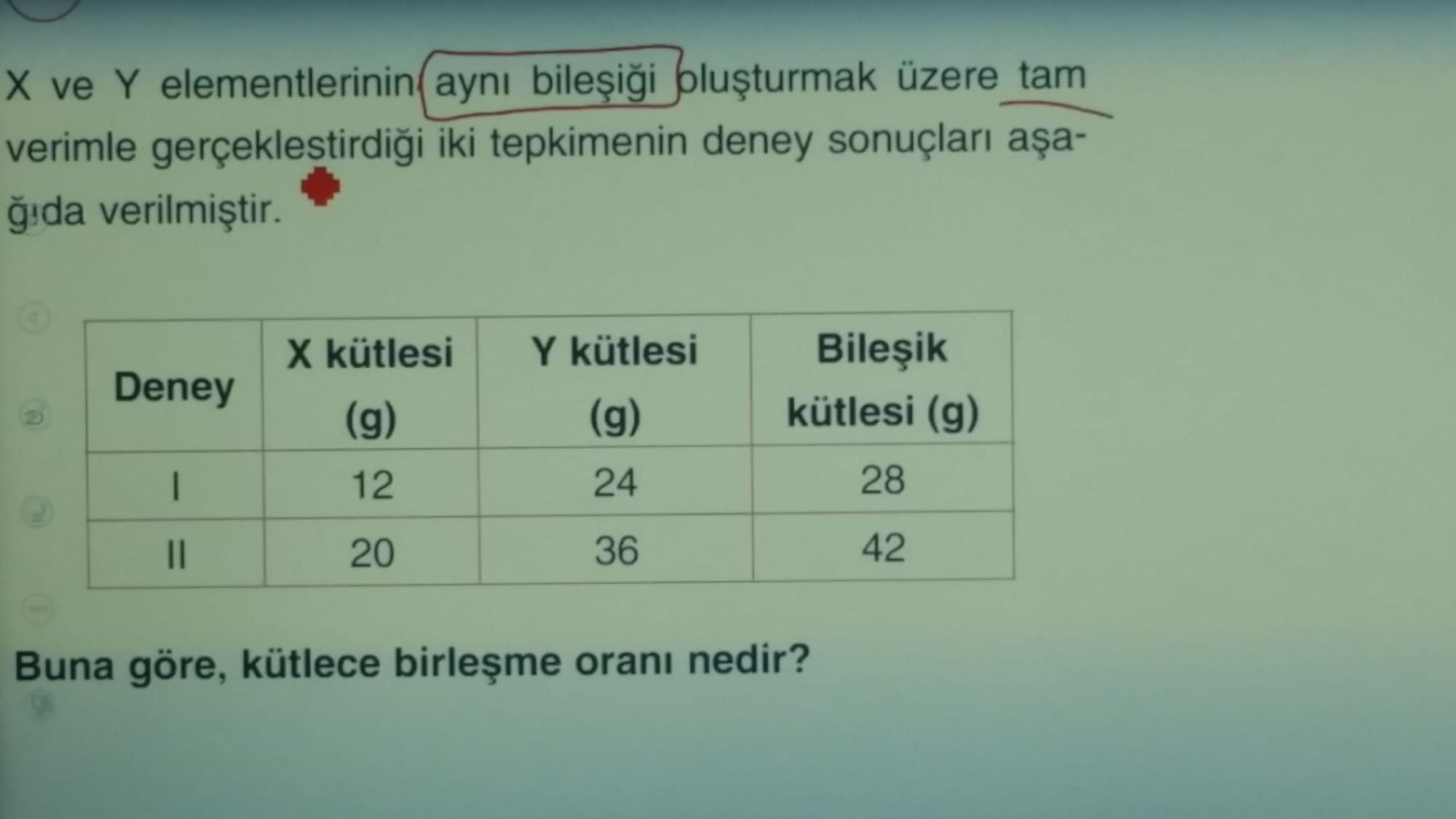 Tam verimle dediği için iki tepkimede de herhangi bir bileşikten biri veya ikisi tamamen harcanmış olmalı. Aslında iki tepkimede de iki elementten ikisi tamamen harcanmamış, sadece birer element tamamen harcanmış. Örneğin 1. tepkimede iki element tamamen harcansaydı toplam kütle 36 olmalıydı fakat 28 olarak verilmiş.