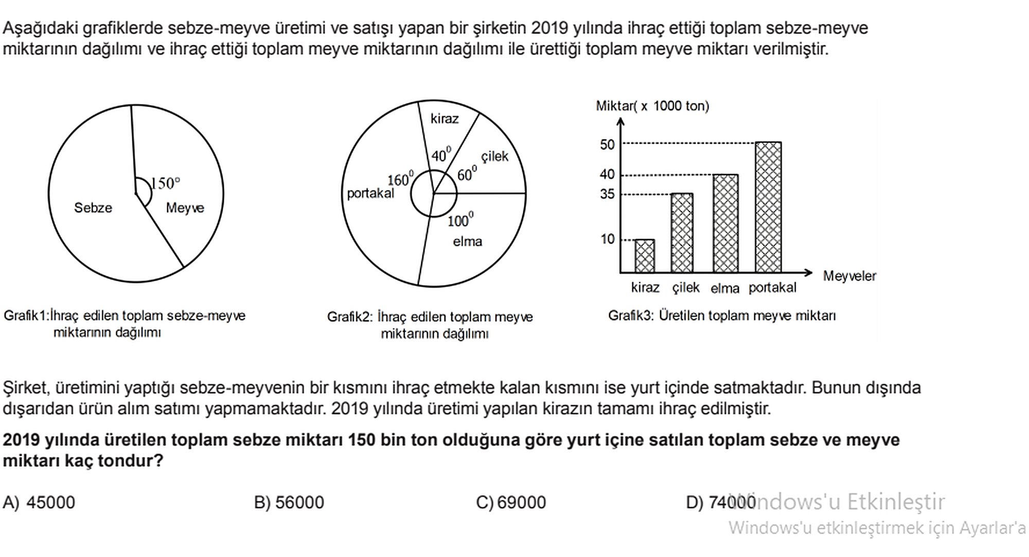 Ihrac edilen sebze ve meyve grafiğine geldigimizde ise 150 derecelil bolum 90k ya denk geldigi icin ve 210 derecelik kısmı öğrenmek istediğimiz icin kucuk birkac kslem ile( 90 k yi 5 e bölüp 7 ile çarparak) 210 derecenin kac tona denk geldigini buluruz. (126k) ve bu bulduğumuz deger bize o yilki ithal edilen toplam sebze miktarini verir. Toplam üretilen sebze değerinden ihrac edilen sebze değerini çıkarırsak (150k-126k=24k) yurtiçine satılan sebze miktarini buluruz.
