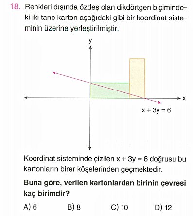x +3y =6 denklemi için x in yerine sıfır yazıldığında y=2 olur yani doğrunun y ekseniyle kesiştiği yer 2 olur. Aynı şekilde y=0 yazarsak x=6 olduğunu görürüz yani doğru x eksenini 6 da kesmiştir. Az önce kartonun küçük kenarının iki olduğunu öğrendik bu bilgi ile ikinci öğrendiğimiz bilgiyi kullanarak kartonun uzun kenarının 4 olduğunu öğreniriz böylelikle çevre 2+2+4+4 ten 12 olur.