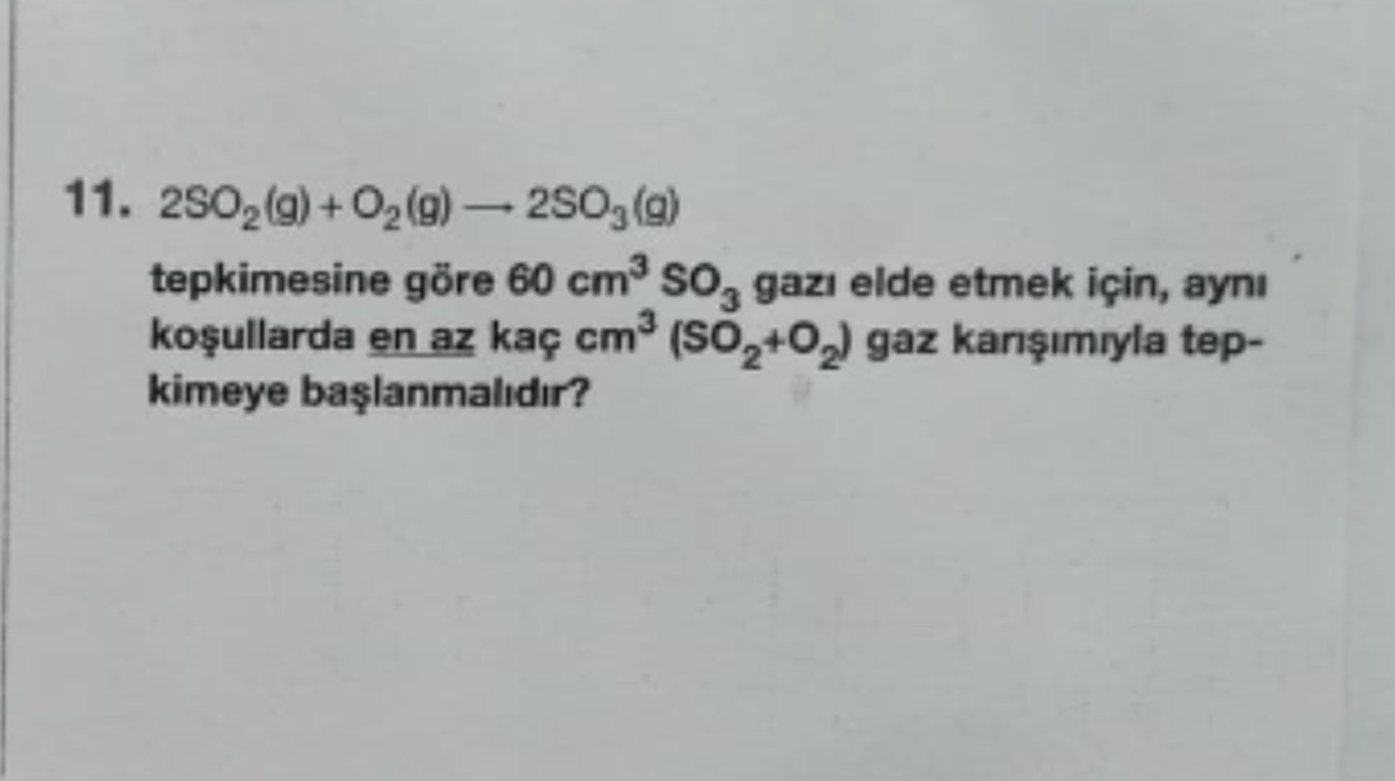 Verilen tepkimeye göre 60 cm3 SO3 gazı elde etmek için, aynı koşullarda en az kaç cm3 gaz karışımıyla tepkimeye başlanmalıdır?