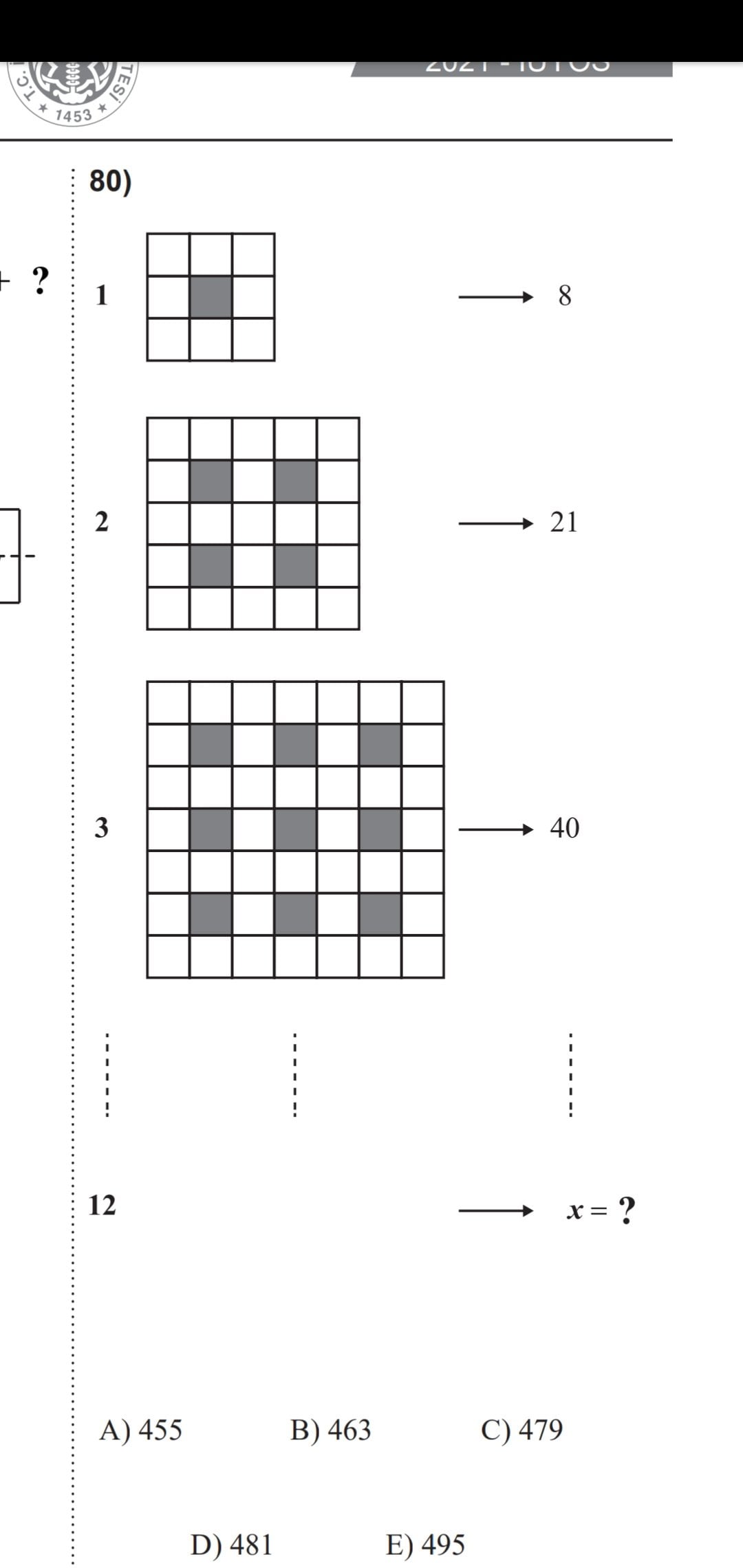 denklemiyle bir aritmetik dizi oluşturmuş burdan 12. terimin kenar uzunluğunu 25 buluyoruz 625-144=481 cevap D şıkkı.[1]