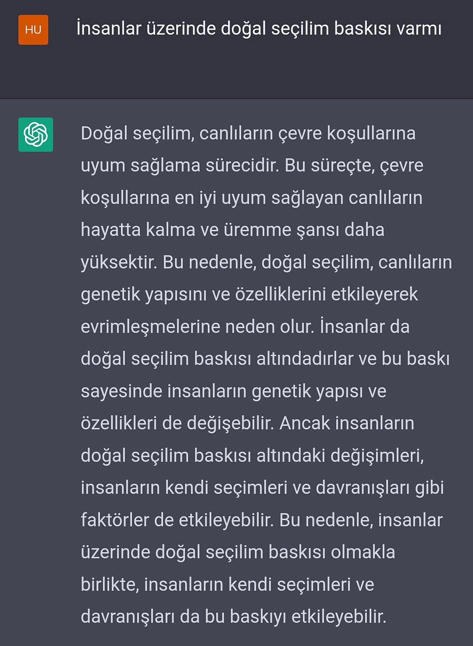 Yapay zekaya sordum. Sizce cevabı mantıklı mı? Yani bizim kendi seçimimiz doğal seçilim baskısını etkileyebilir mi?