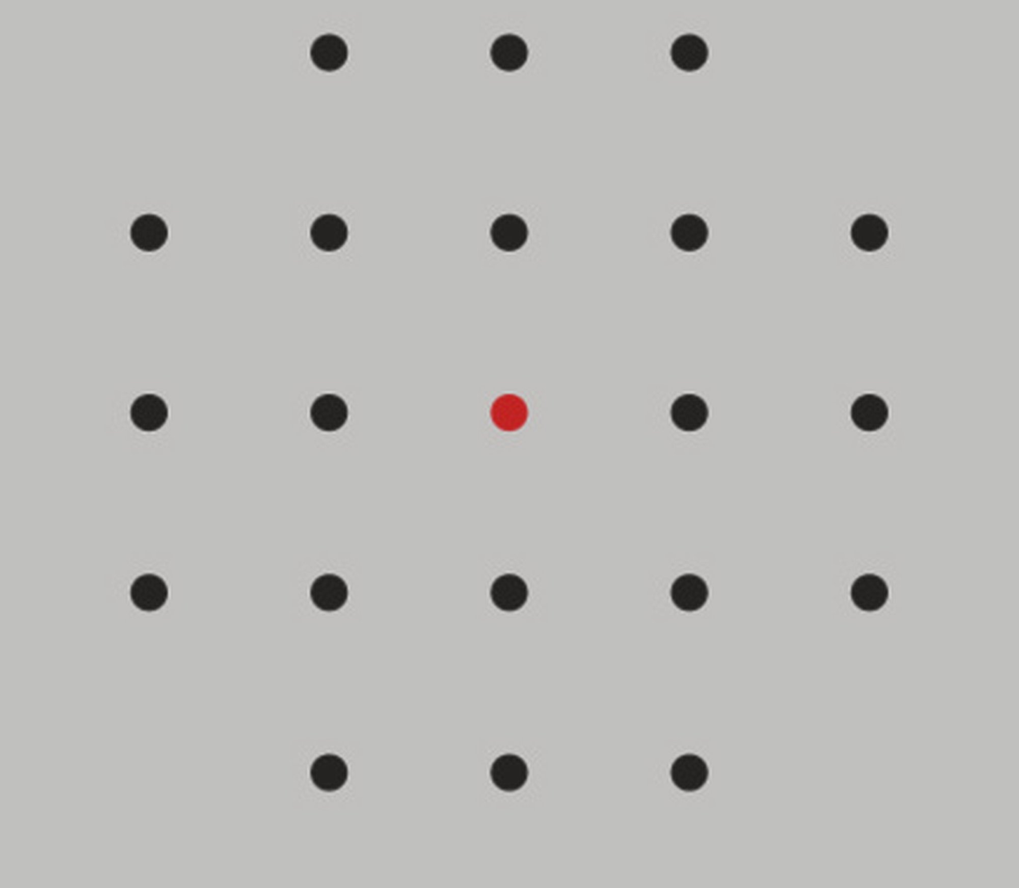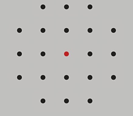 Kırmızı nokta bizim ilk noktamız kalan iki noktamızı ise siyah noktalardan seçeceğiz. Bu seçme adımını C(20 , 2) = 190 işlemi ile gerçekleştirebiliriz. Ancak yukarıda da belirtildiği gibi üç nokta da aynı doğru üzerinden geçmemeli. Biz ise geçen noktaları da saydık, bu yüzden onları çıkarırarak{ 2 × P(4,2) + 2 × P(2,2) } 176 farklı üçgen çizilebileceğini gösterebiliriz.