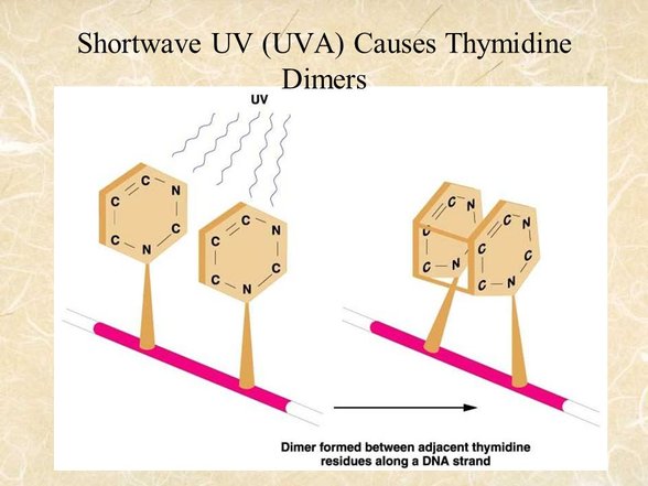 Görünür ışıktan daha kısa dalga boylu olan bunun sonucunda daha fazla enerjiye sahip olan UV ışınları organik molekülleri bozma özelliğine sahiptir. DNA'yı oluşturan pürin ve pirimidinler bu UV radyasyondan etkilenirler. Bu organik moleküller ( A,T,G,C,U) UV radyasyonunu 260 nm'de absorblamaya başlarlar. UV radyasyonunun DNA üzerindeki esas etkisi, pirimidin dimerlerini özellikle de Timin kalıntıları'nı oluşturmasıdır. DNA ipliği boyunca komşu timin kalıntları UV radyasonun etkisiyle dimerleşir yani Timin halkaları arasında kovalent çapraz bağlar oluşur. Bu dimerleşme DNA yapısını bozar ve normal eşlenmeyi inhibe eder, eşlenme sırasında hatalar oluşur.