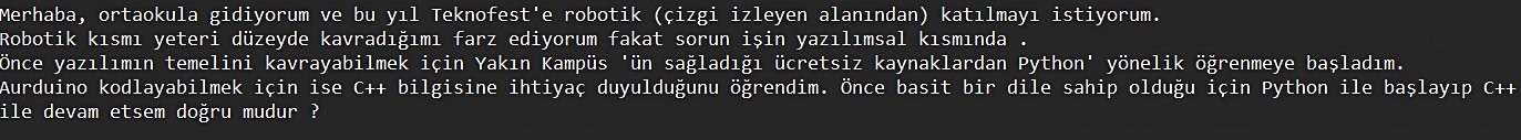 Teknofest' katılırken projem için yazılım öğrenmeye çalışıyorum fakat kullandığım yöntemin doğruluğundan şüphe ediyorum. Soru sığmadığı için görsel oalrak ekledim. Teşekkürler...