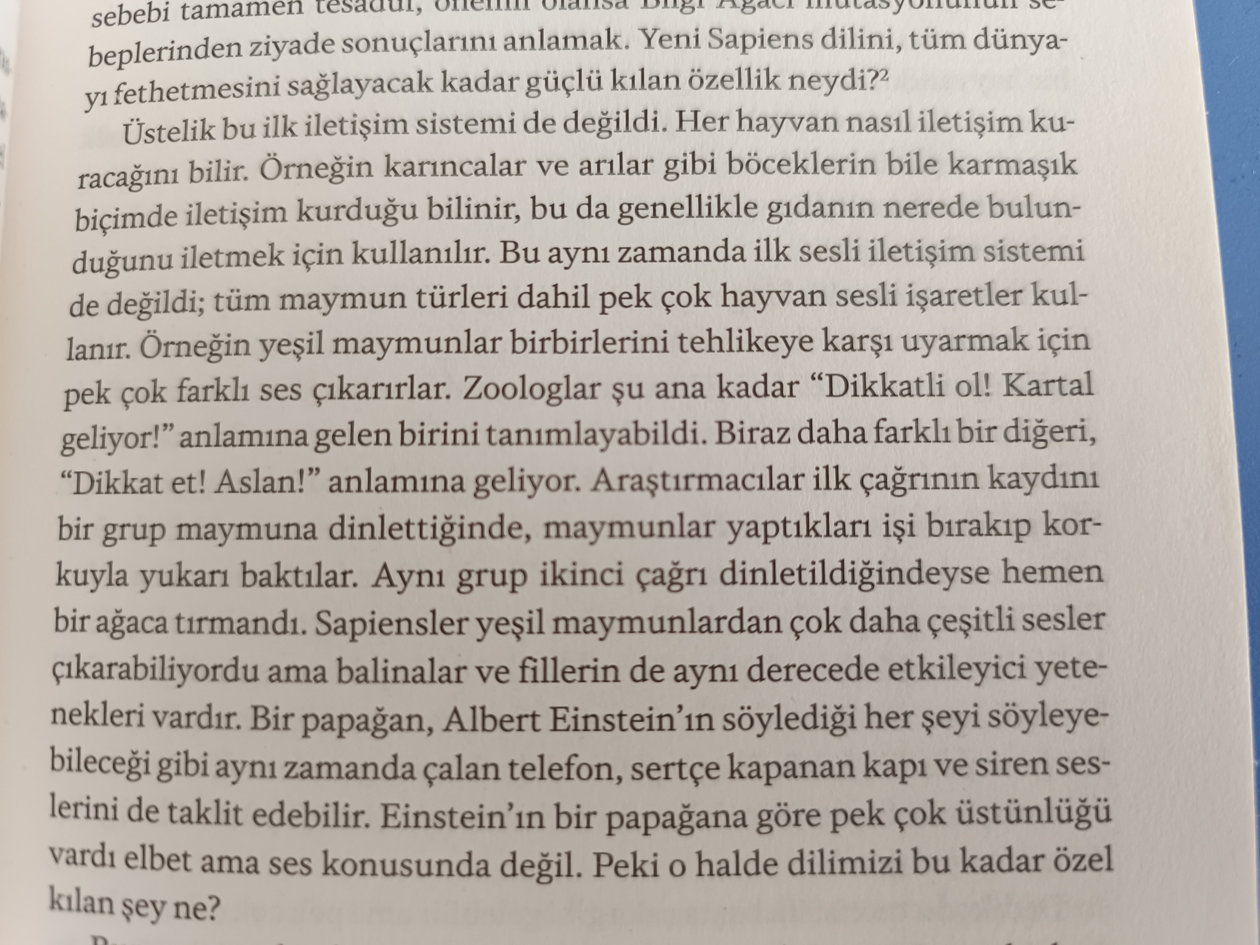 Yuval Noah Harari'nin Hayvanlardan Tanrılara: Sapiens kitabında kaynak belirtilmemiş bir bölüm var. Yeşil maymunların homurdanmalarının bazı anlamlara geldiğinden bahsediliyor (kitapta yazan şey, bir maymunun diğerine "dikkat et aslan geliyor" demesi). Biraz araştırdım ama kaynak ve böyle bir deney bulamadım yardımcı olursanız sevinirim.
