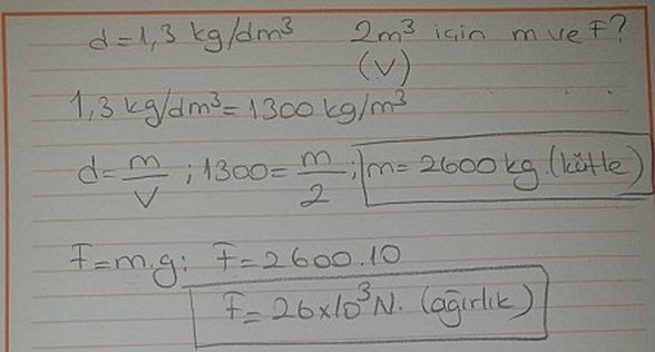 Birimler çok önemlidir örneğin eğer kg kullanacak iseniz m3,m,s ile işlem yapmanız Newton birimine geçişinizi kolaylaştırır. Dolayısıyla yoğunluğu öncelikle SI birim sistemine göre kg/m3'e çevirdim. Ardından zaten yoğunluk ve kuvvet formüllerini uygulamak kaldı.