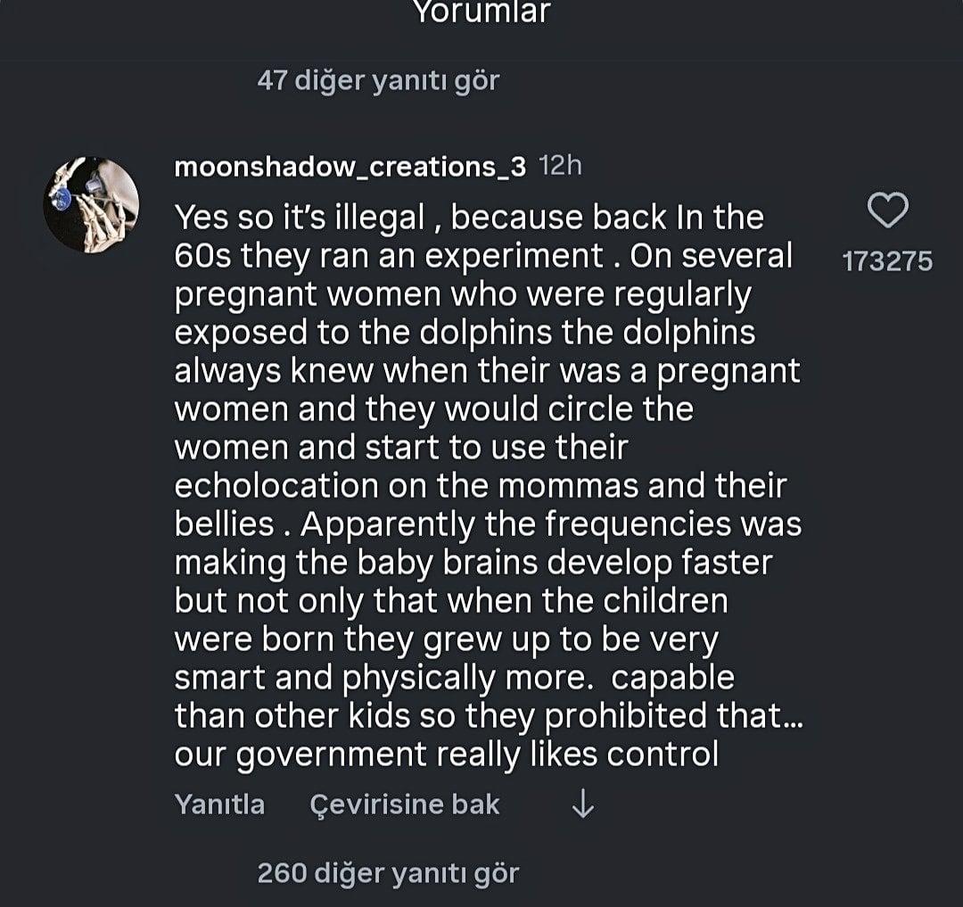 Muhtemelen komplo teorisidir ama yunusların çıkardığı titreşimlerin doğum sancılarını yok ettiği hatta bu frekanslara maruz kalan anne karnındaki bebeklerin de çok yüksek IQ ile doğduğu iddiasını gördüm. ABD Hükümeti zeki insanlar istemediği için yunuslarla iletişim kurmayı yasaklamış. Böyle bir şey mümkün olabilir mi? ekteki yorum 173k like almış