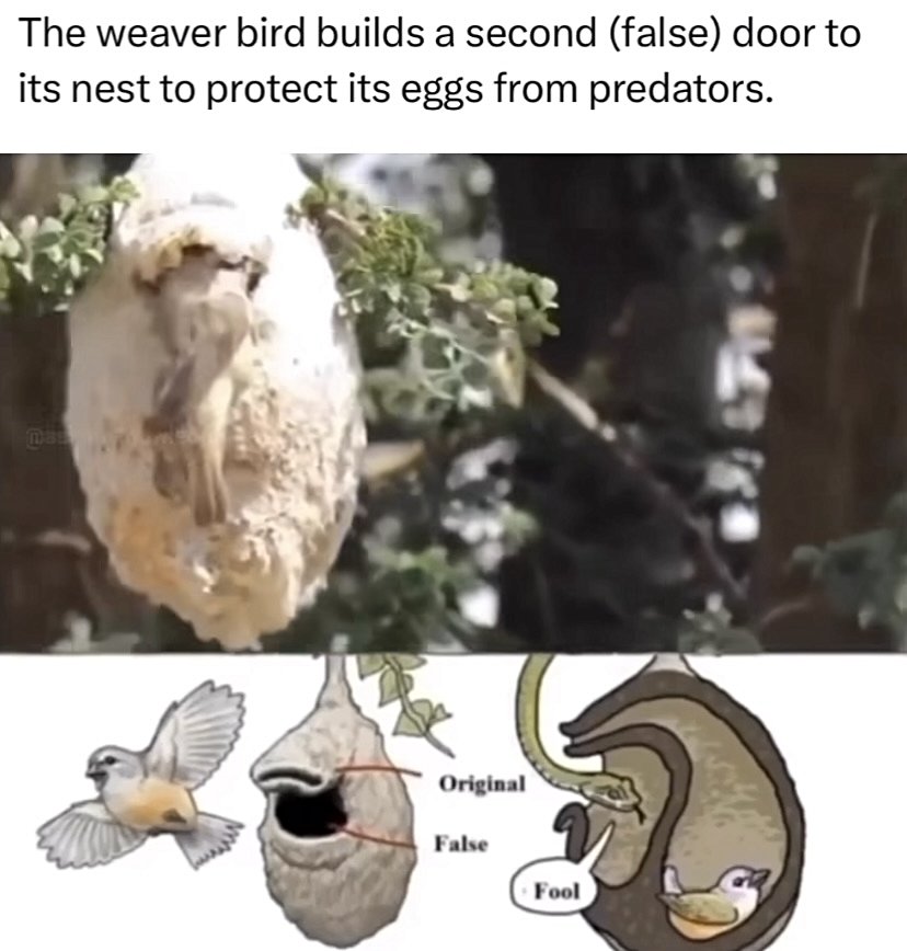 Weaver bird diye bahsedilen (Ploceidae) bir kuş türüne ait bir bireyin, yuvasındaki yumurtalarını olası avcılardan korunmak için böyle bir sahte giriş hazırladığını gördüm. Bu gerçek midir? Gerçekse bu içgüdüsel, türe özgü bir olay mıdır yoksa kuşun deneyimleriyle gerçekleştirdiği bir şey midir?