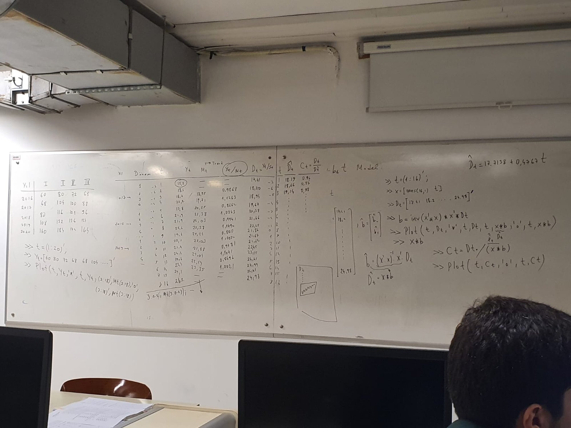 hocanın matlab kodundan bazısı; Mt(i) = (Yt(i-1)+0.5*Yt(i-2)+Yt(i)+Yt(i+1)+ 0.5*Yt(i+2)) /4; xt = [15.2 18.4 18.7 22.2 ....] S = [0.8732 1.0109 0.9873 1.1286....] %Dt = Yt./S Dt = [17.41 18.20 18.94 19.67...] b = inv(x'*x)*x'*Dt; Ct = Dt./(x*b) hoca Yt,Mt,St,Dt,B gibi değerlere nasıl ulaştı bunlar nedir tahtata yazan St değerleri yanlış yazlms