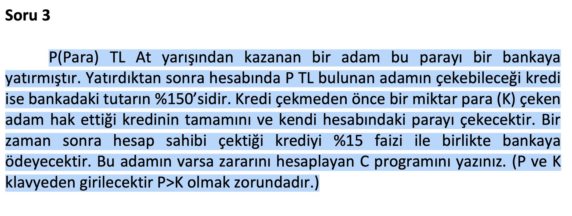 printf("Kredi cekmeden once cekilen parayi tekrar giriniz (K) : ");
