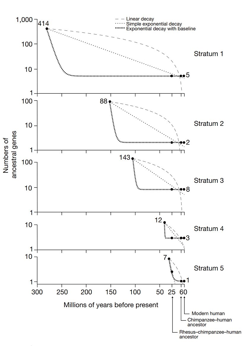 Gerçekten de Y kromozomunun farklı bölgelerindeki gen sayısının zaman içinde değişimini ölçen bilim insanları, o bölgelerdeki körelmeyle ilgili aşağıdaki grafikleri ürettiler ve her biri için farklı trendleri test ettiler ve sadece eksponansiyel bir trendin son 20 milyon yıldaki sabitliği yansıtabildiğini gördüler: