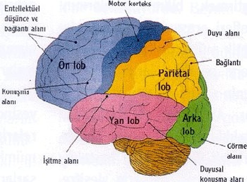 Fotoğrafta gördüğünüz gibi beyin 4 ana lobdan oluşur. Ve bu loblar birçok farklı görevler üstlenir. Beynimiz, kraniyal sinirler ve omurilik sayesinde merkezi sinir sistemini kontrol eder, çevresel sinir sistemini yönetir, yani kısaca hemen hemen insanın tüm yaşamsal ve davranışsal işlevlerini kontrol eder.