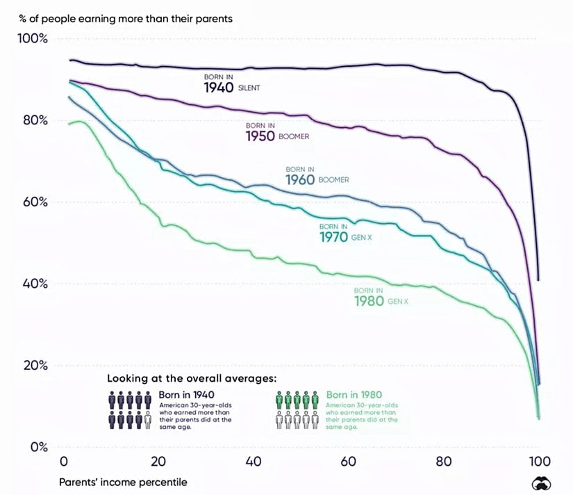 Buna karşılık hepimiz, bir gün zengin olma hayaliyle yaşamaktayız. Ne yazık ki bu, ortalamada koca bir hayalden ibaret ve veriler de bunu net bir şekilde gösteriyor: 1940'larda doğmuş birinin ebeveynlerinden yüksek gelir elde etme ihtimali %90'lardaydı. Her nesilde bu oran kademeli olarak düştü. 1980'lerde doğanlar için ebeveynlerini geçme ihtimalleri %50 civarına geriledi.