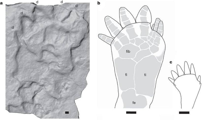 Evrimsel süreçte denizlerden karalara geçişin lop yüzgeçli balıklar ve spesifik olarak akciğerli balıklar üzerinden olduğunu ve yüzgeç yapılarının öncelikle ayaksı yapılara, sonrasında karaya geçişle birlikteyse bildiğimiz dört üyeli (uzuvlu) hayvanların bacaklarına evrimleştiğini biliyoruz. İrlanda'da bulunan Valentia Adası'nda, 385 milyon yıl önce karalara adımlarını yeni yeni atmaya başlayan atalarımızın eksiksiz ayak izleri keşfedildi.