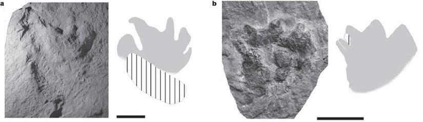 Görselden de inceleyebileceğiniz ayak izleri gibi çok sayıda ve hayvanların büyüklüğüne bağlı olarak değişen şekillerde ayak izleri tespit edildi. "Manus" adı verilen el ve "pes" adı verilen ayak izleri, çapraz adım hareketine uygun bir şekilde izler bırakmıştır. Yukarıdaki görseldeki izler, görselin altından üstüne doğru yürümüş bir canlının izleridir. Görselin "b" kısmının sol tarafında tipik deniz-kara geçişi örnekleri olan Ictyostega ve Acanthostega cinslerinden örnekler bu adımlara uygun hale getirilerek gösterilmektedir. Sağ taraftaysa Tiktaalik canlandırması görülmektedir. Görselin "c" şıkkında ise, çaprazlamasına atılan adımların (sol el ile sağ ayak ileri, sonrasında sağ el ile sol ayak ileri şeklinde) nasıl göründüğü ve fosilleşmedeki karşılıkları gösterilmektedir.