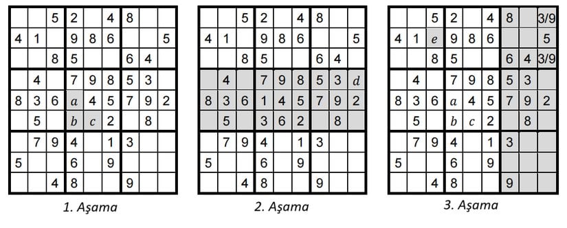 1. aşamadaki bir ızgaraya sahip olduğumuzu varsayalım. aa'yı içeren satır diğer tüm rakamları içerdiği için a=1a=1 olmalıdır. bb'yi içeren sütun 3 hariç tüm rakamları içerdiği için b=3b=3 olmalıdır. Son olarak a,ba, b ve cc'yi içeren blok 6 hariç tüm rakamları içerdiği için c=6c=6 olmalıdır.