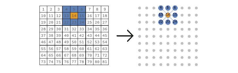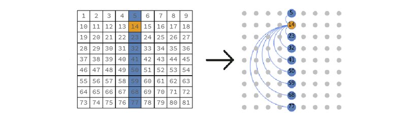 Bu bağlantıları; yaptığımız gibi satırlar, sütunlar ve bloklar temelinde kurarak her düğümün aşağıdaki şekilde bağlandığı bir grafik oluşturuyoruz:
