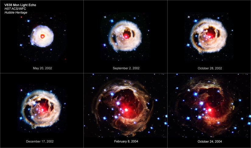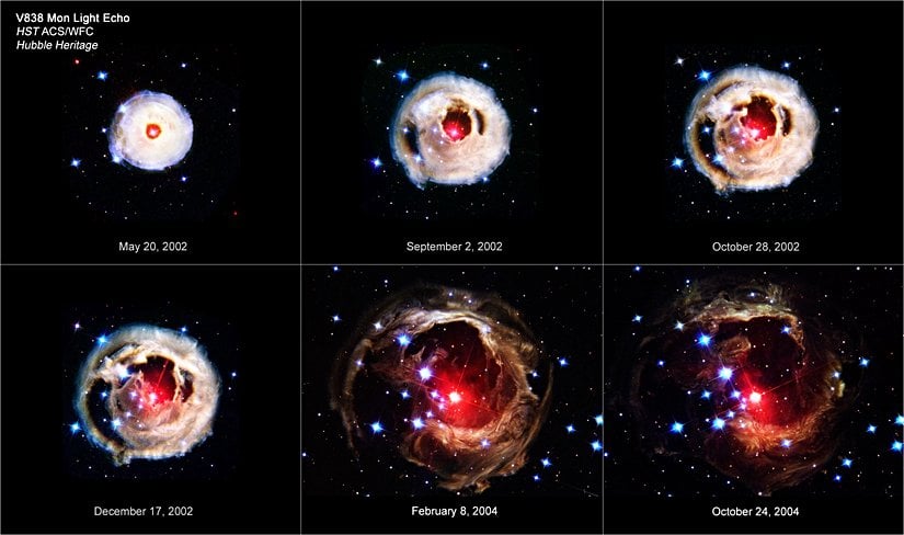 Hubble Space Telescopeİlk akla gelen şey, bunun dışarıya materyal fırlatmaya neden olan bir süpernova patlaması olması olsa da hiçbir fiziksel cismin bu absürt hızlara ulaşamayacağını biliyoruz. Aynı zamanda bunun bir süpernova patlaması olmadığını da, süpernovaların bizlere gösterdiği spektral kimliklerinden anlayabiliyoruz. Sonradan anlaşıldı ki gerçekte bu değişen yıldız, birtakım astrofiziksel süreçler sonrasında (belki de bir birleşme sonrasında), bir anlık parlaklığında bir artış gösterdi. Bu ani artış, tıpkı bir flaşın patlaması gibi etrafında daha önceden de var olan ama yeterli ışık olmadığı için görülemeyen materyali aydınlatarak ilerledi. Yani aslında orada ışıktan hızlı yayılan bir bulutsu yoktu; tam aksine bulutsu daha önceden de zaten oradaydı, ama ilk defa bu ışık dalgasıyla aydınlatıldı.