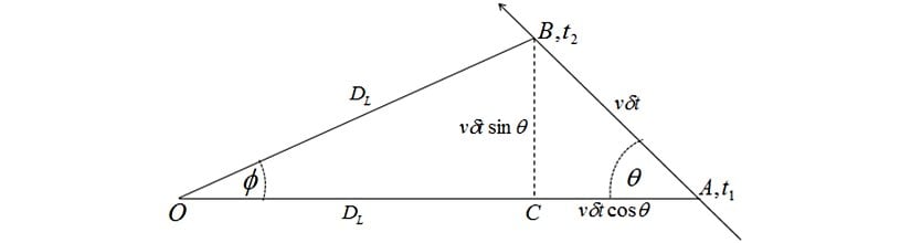BC=DLsinϕ≈ϕDL=vδtsinθBC=D_L\sin{\phi}\approx \phi D_L = v\delta{t} \sin{\theta}
