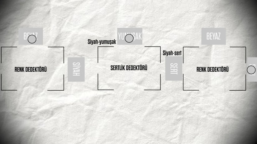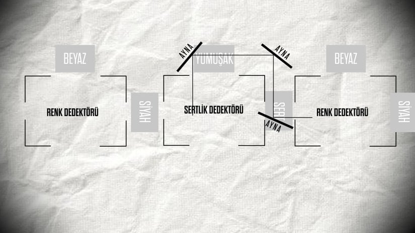 Takip edelim: Yine, soldan renk dedektörümüze 800 elektron giriyor, 400 beyaz 400 siyah ayrılıyor. O 400 siyahı sertlik dedektörüne gönderiyoruz ve 200 sert 200 yumuşak olarak ayrılıyor. Ama bu defa, ayrılan yumuşak elektronları aynalarla yönlendirip, dedektörün arkasında tekrardan siyahlarla birleştiriyoruz ve yine karışık (dolayısıyla belirsiz) 400 elektron elde ediyoruz. Sonra bunları tekrardan, ikinci bir renk dedektörüne, yani en sağdaki dedektöre gönderiyoruz. Sizce bu defa siyah ve beyaz dağılımı nasıl olurdu? Yine ilk deneydeki gibi 200 siyah 200 beyaz şeklinde mi?