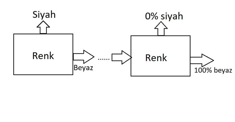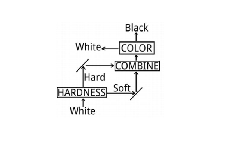 Üçüncü deney biraz daha karmaşık olsun. Diyelim ki beyaz elektronlar, sertliği belirleyen bir makineden geçiyor. Yarısı yumuşak, yarısı sert olan bu elektronlar, yine iki aynadan üçüncü bir aynaya yansıyorlar ve ışınları burada tek bir ışında birleşerek renk makinesinden geçiyor. Bu elektronların yüzde kaçı beyaz, yüzde kaçı siyah olacaktır?
