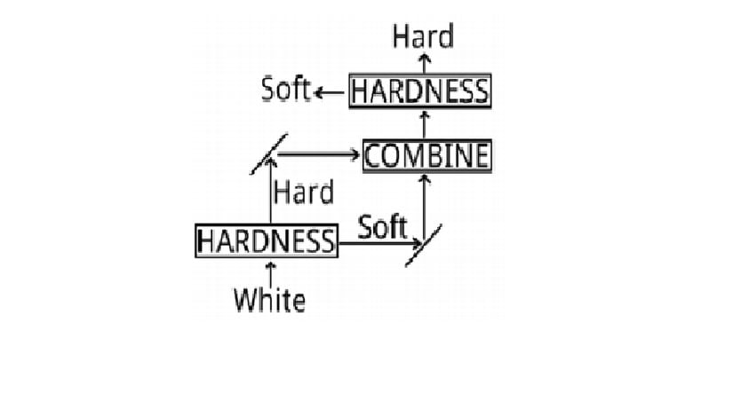 Beyaz elektronların makineye girdiklerinde, %50 yumuşak, %50 sert olma ihtimalleri vardır. Yumuşak olanlar yumuşak, sert olanlar da aynı şekilde yansıyacaktır; çünkü aynaların tek yaptığı elektronların hareket yönünü değiştirmektir. İki ışının tek bir ışına dönüştüğü üçüncü aynada da durum aynıdır, elektronların %50’si sert, %50’si yumuşaktır; bu yüzden son makineye girdiklerinde sertlik ve yumuşaklık oranı tekrar %50-%50 olacaktır.