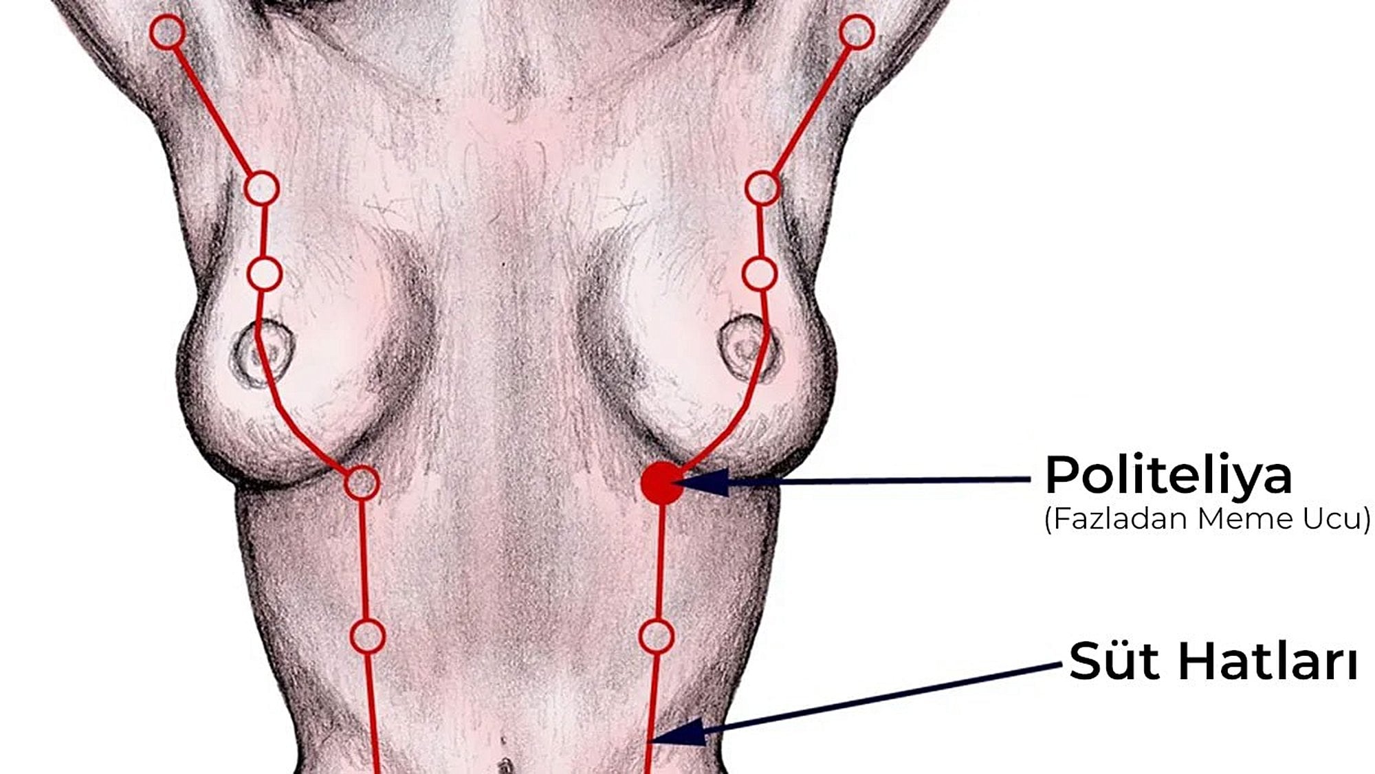 Yukarıdaki fotoğrafta, bu hat net bir şekilde gösterilmektedir. Bu meme hattı, memeleri ve süt bezlerini üretir; ancak insanlarda bu sadece "normal" kabul edilen meme bölgesinde olmalıdır.